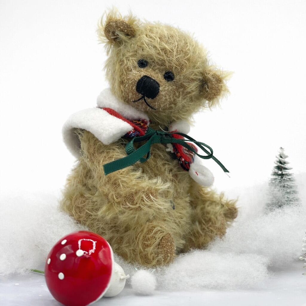Entdecke Bärino Alfons, den 14 cm großen Künstlerbären! Dieser einzigartige Bär wird von mir in liebevoller Handarbeit aus hochwertigem Mohair gefertigt und ist ein echtes Unikat. Sein Pulloverhält ihn im Winter schön warm und macht ihn zu einem stilvollen Begleiter.