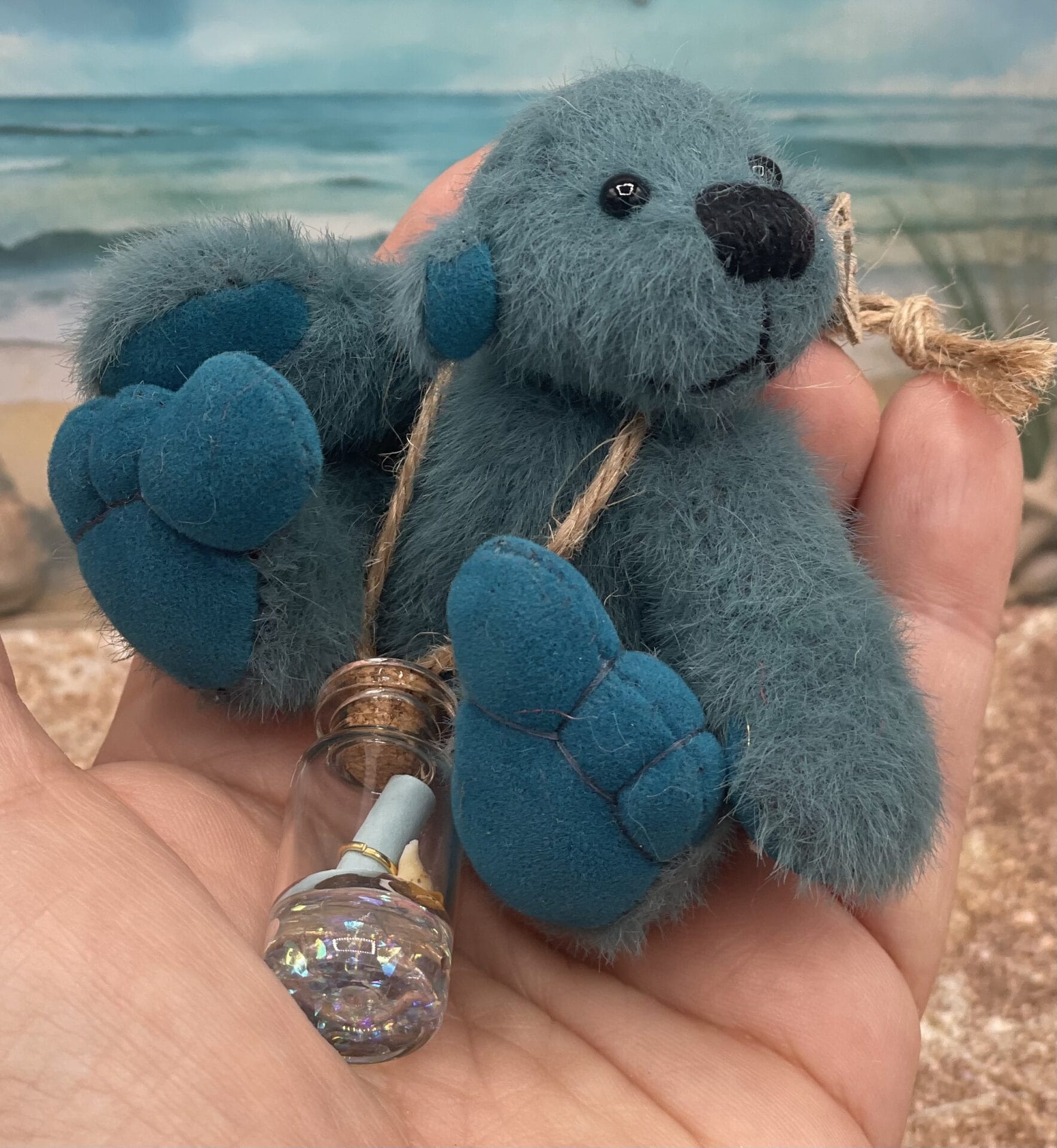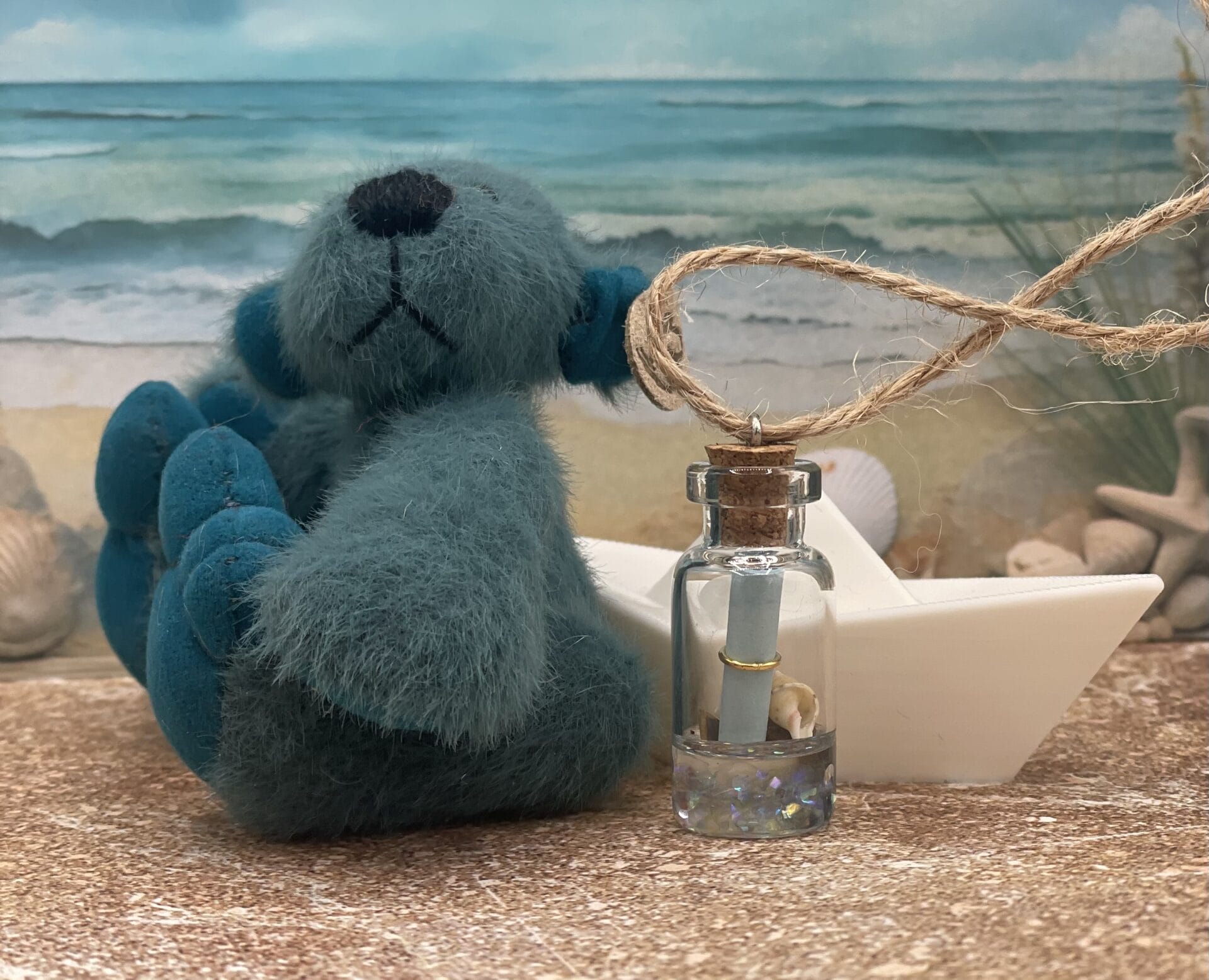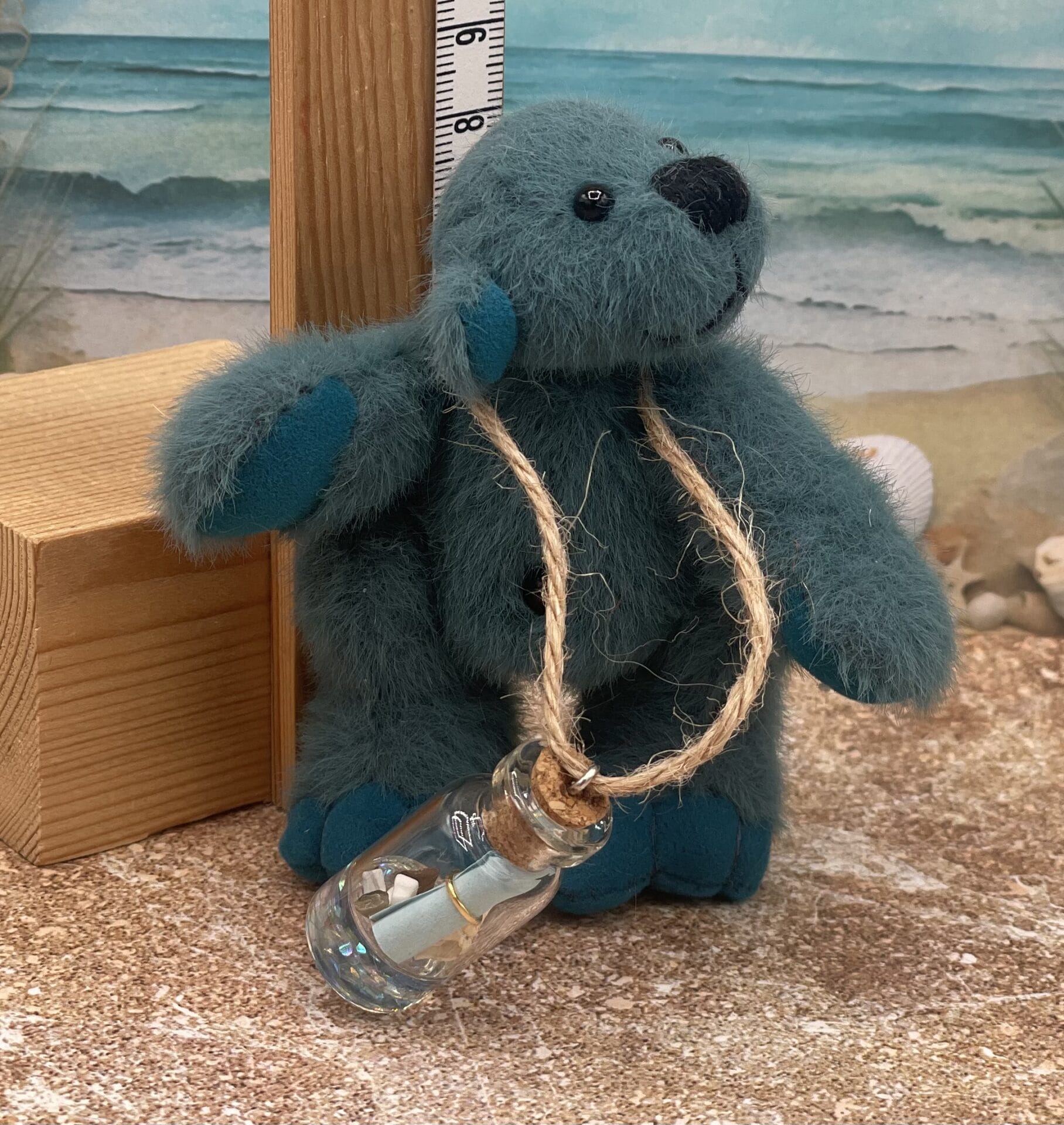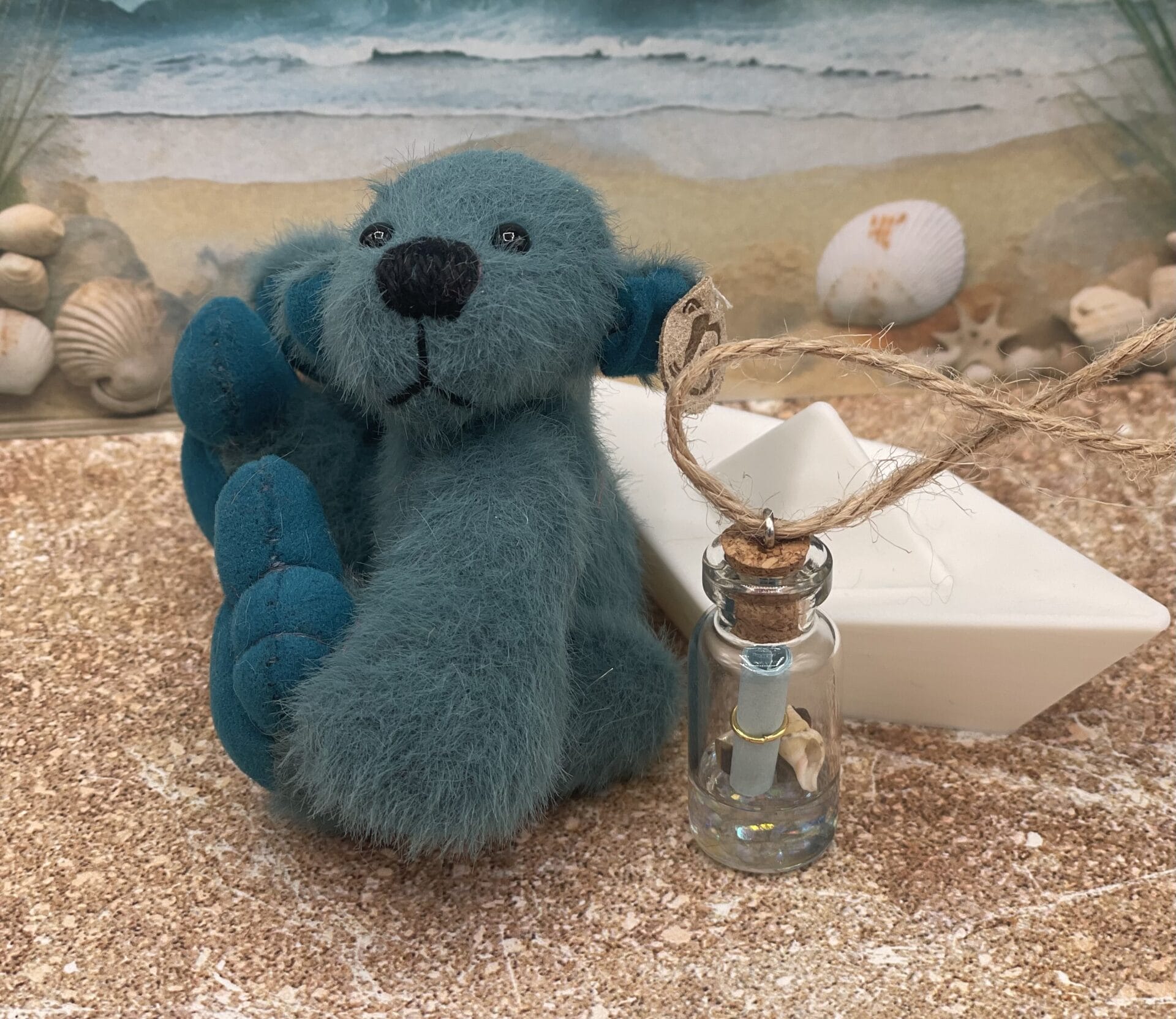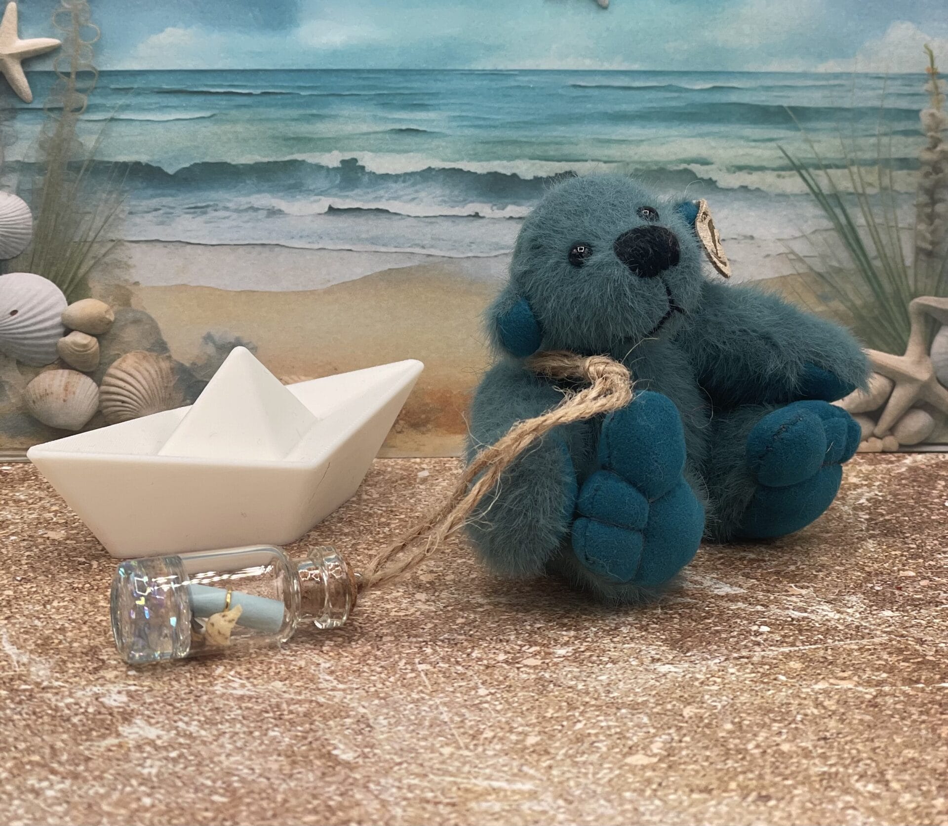 Besonders einzigartig ist die kleine Flaschenpost, die er in den Pfoten hält – ein liebevolles Detail, das seine Abenteuerlust und seinen Charme unterstreicht.