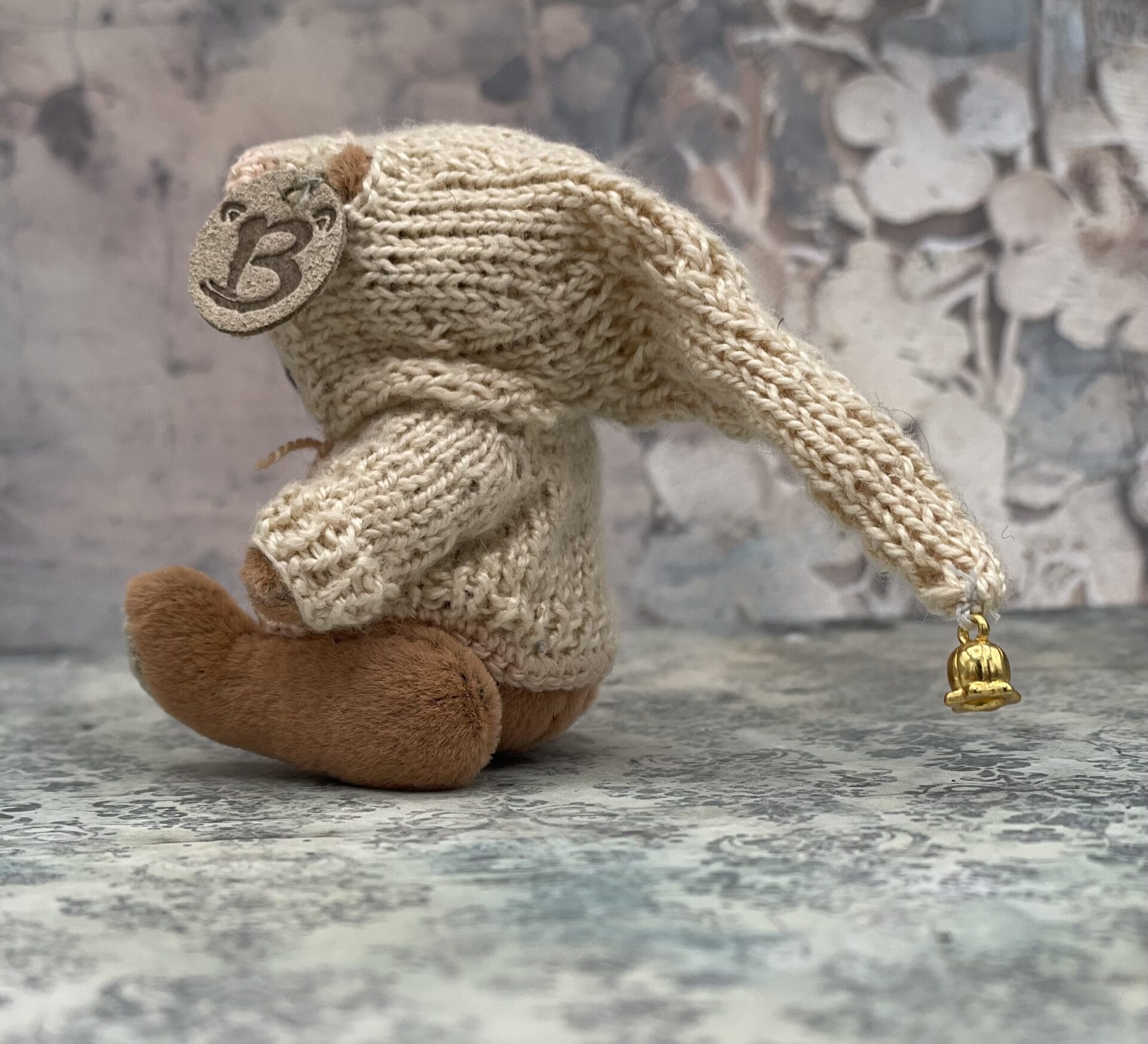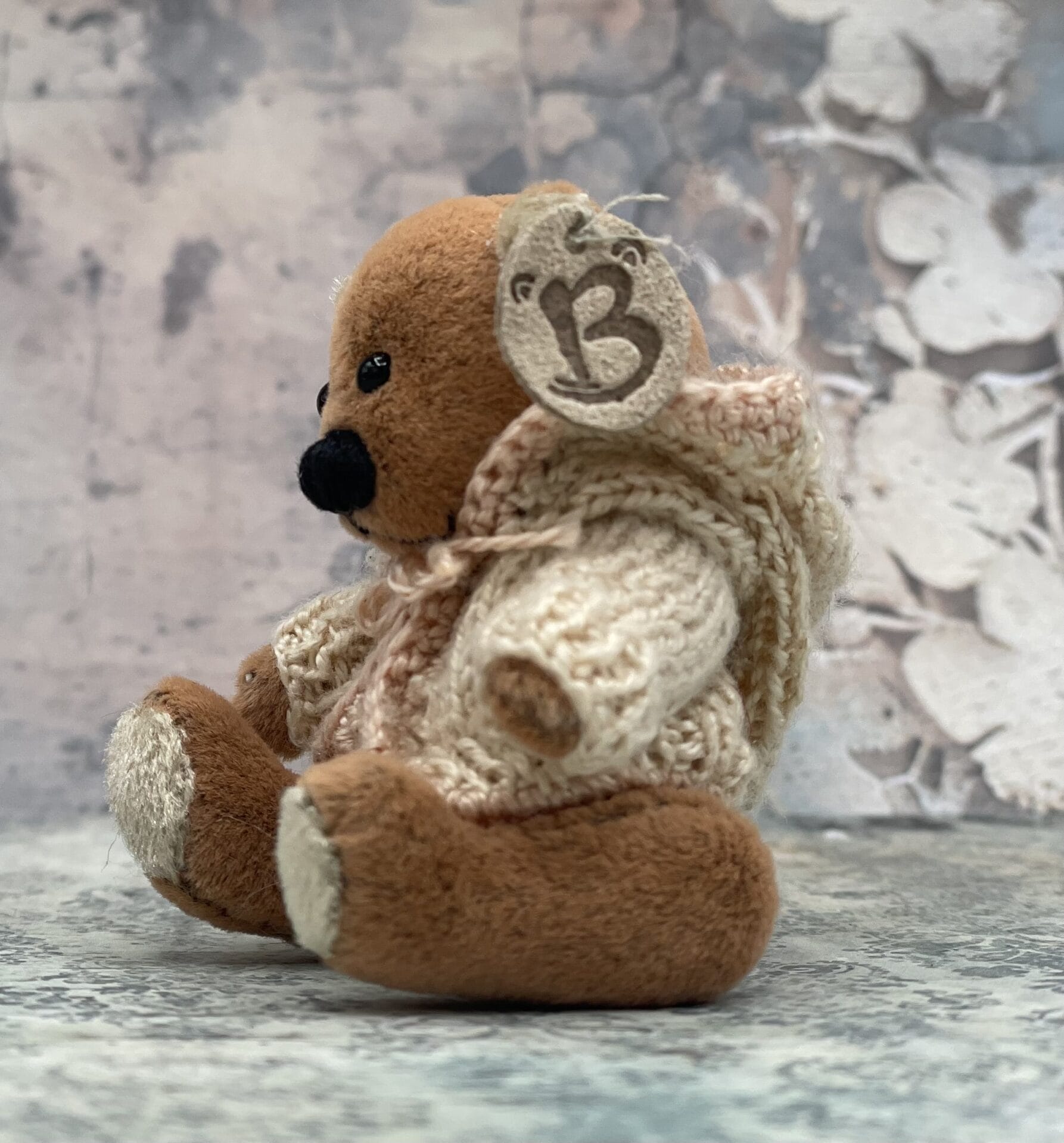 Wenn er zu Dir kommt, hat er, wie alle Bärinos eine kleines Lederlogo mit dem „B“ am Ohr, welches das geschützte Logo meine Marke Bärino ist.