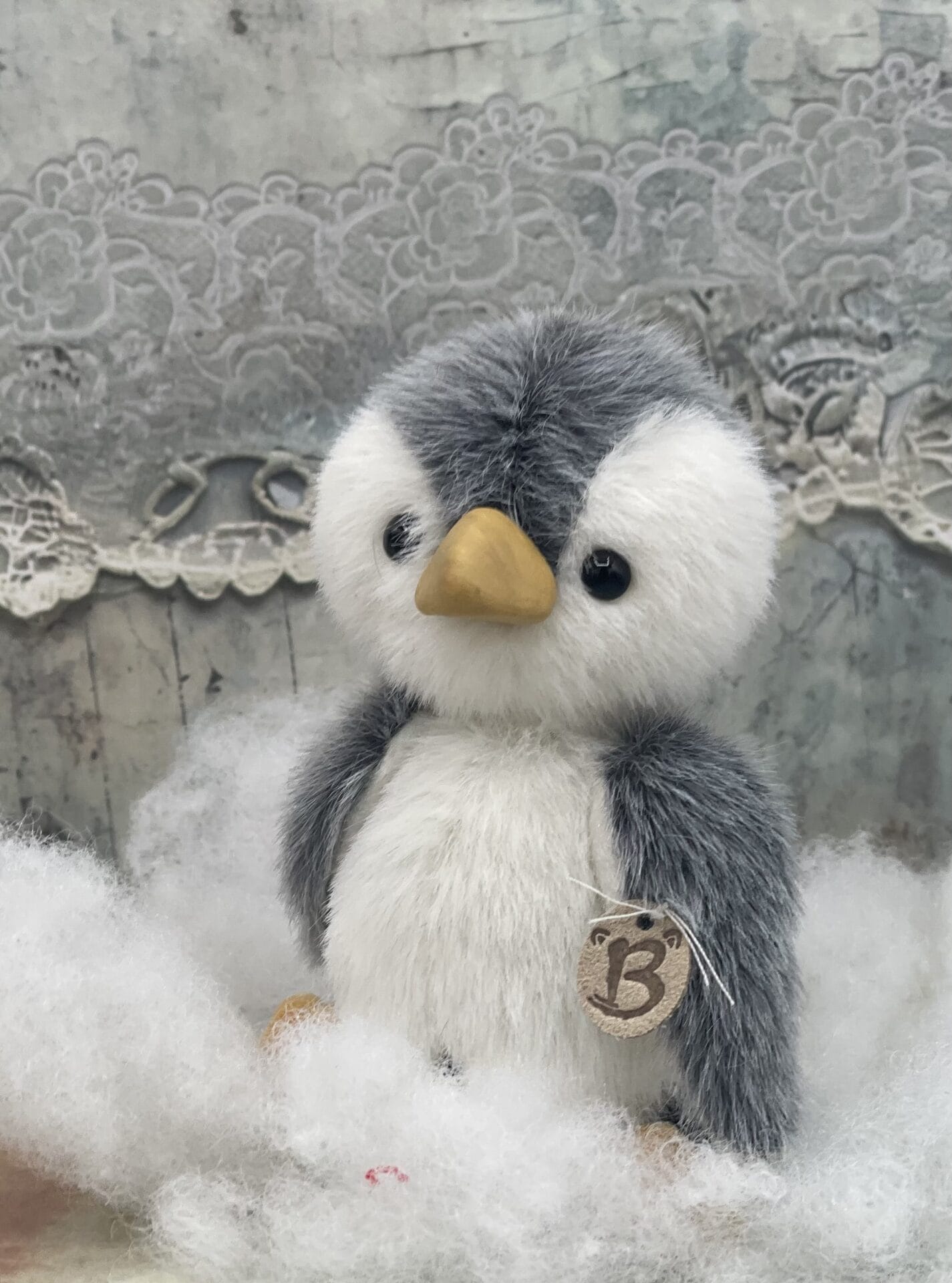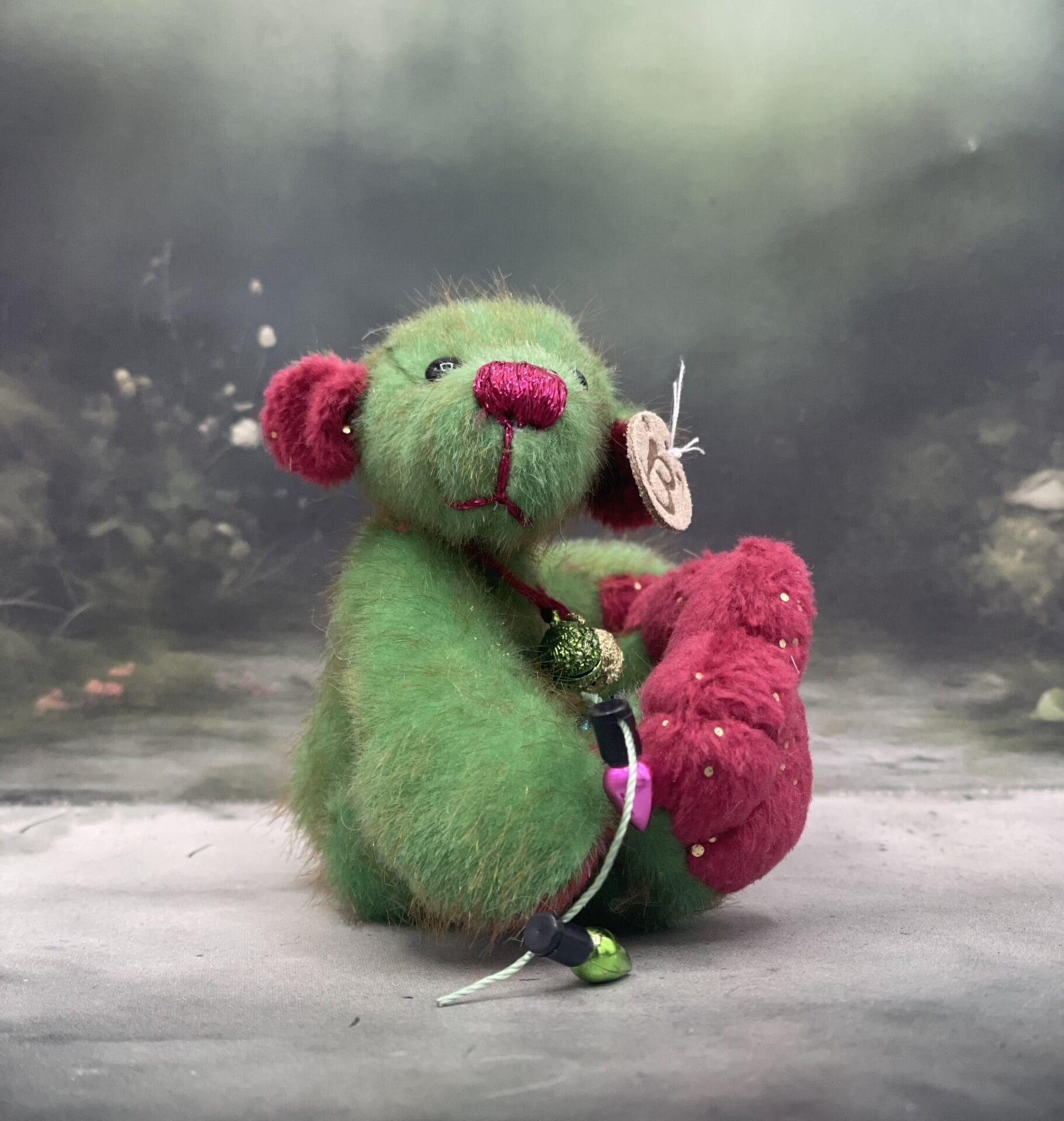 Dieser kleine Künstlerbär misst ca. 9 cm und ist ein von Hand gefertigtes Einzelstück aus weichem Minipile.