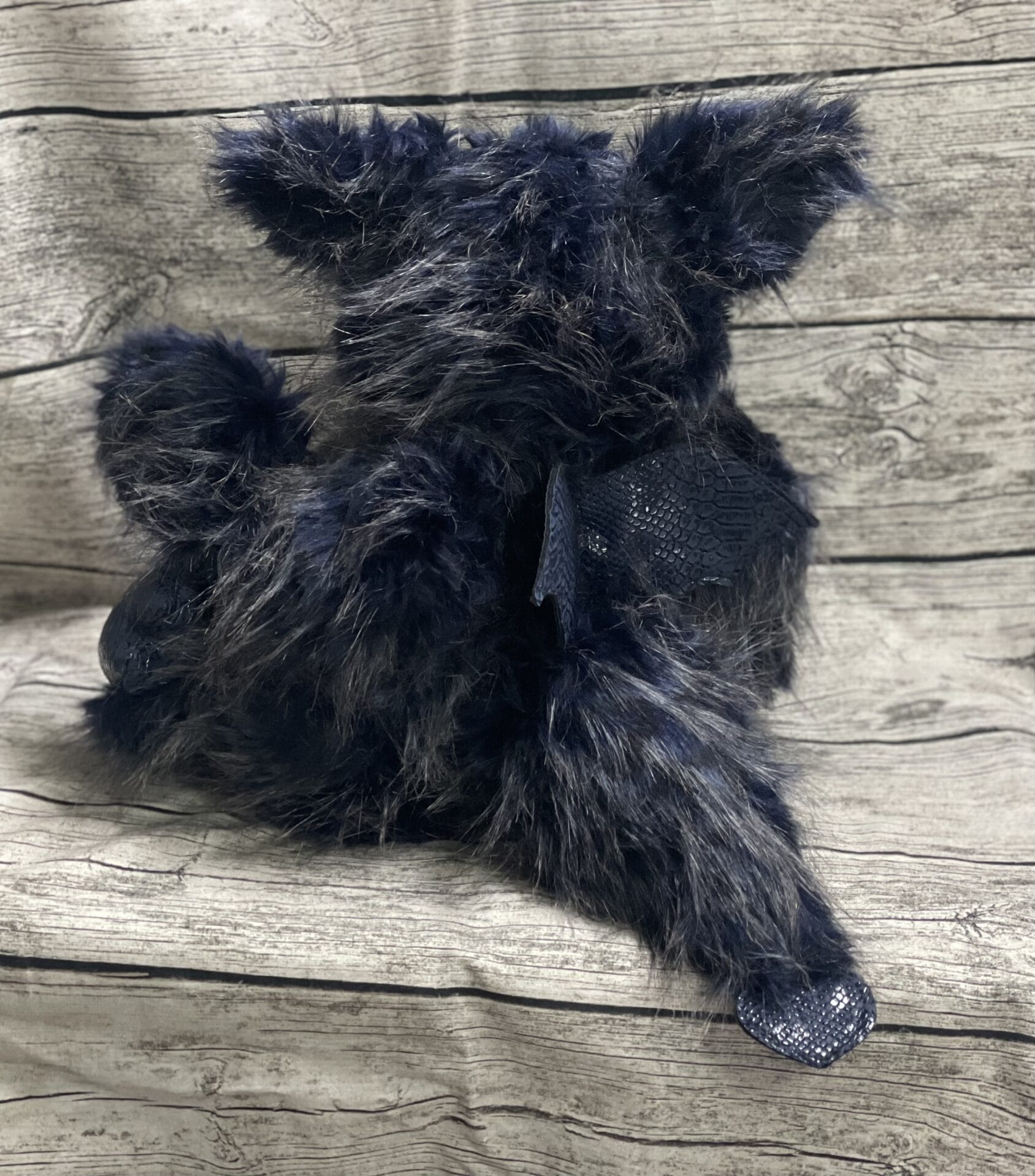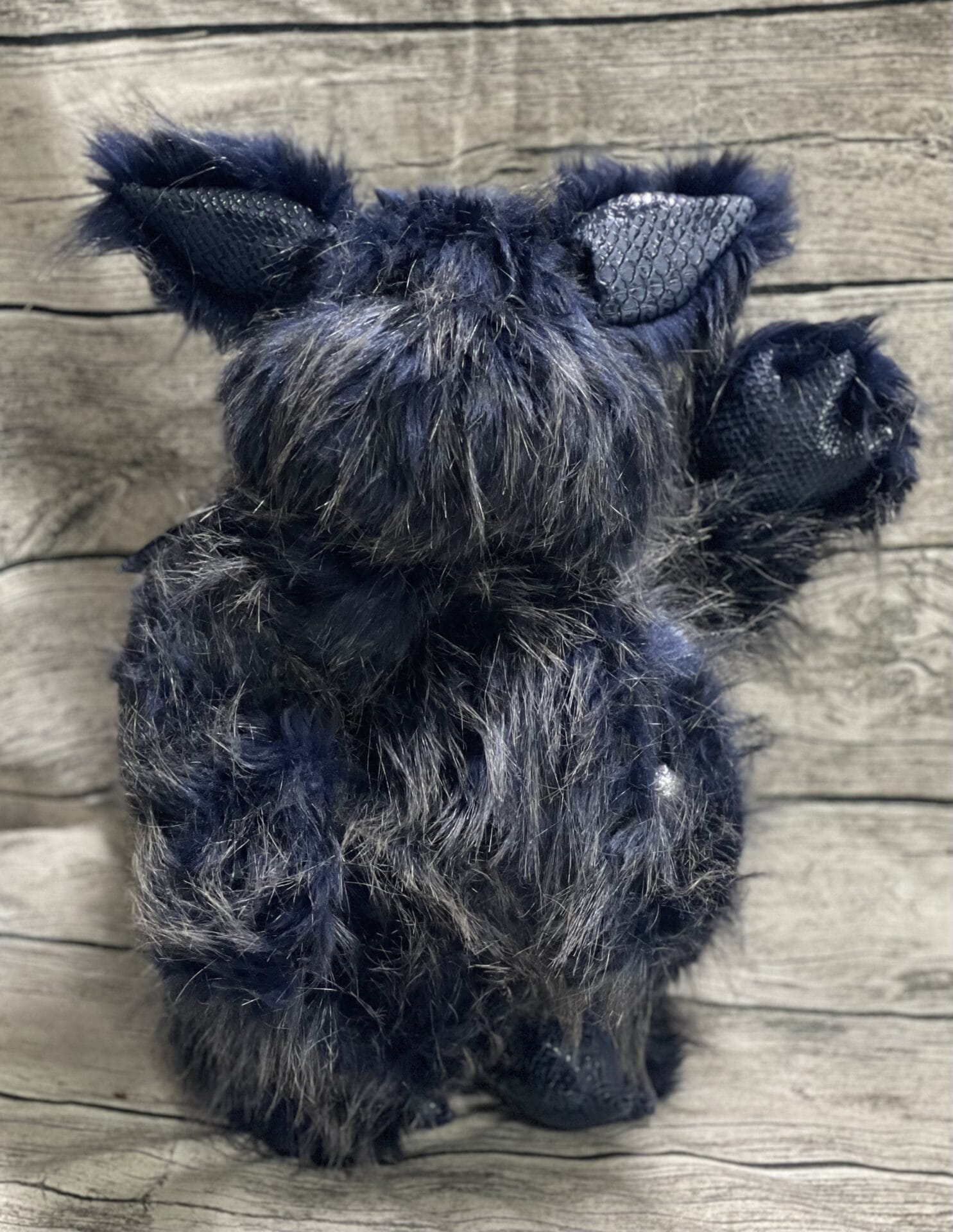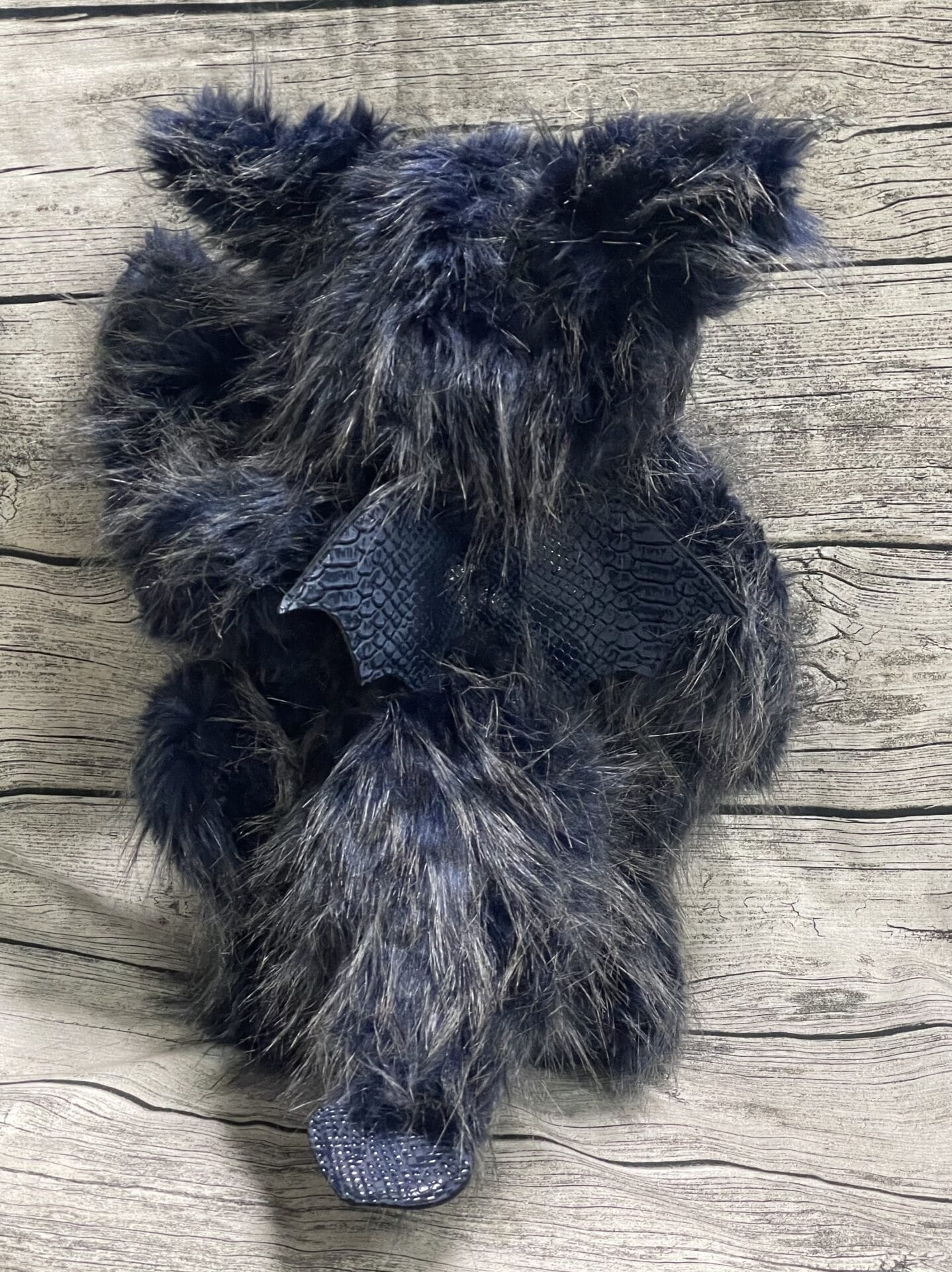 Er ist aus dunkelblauen Plüsch mit silbergrauen Spitzen gefertigt.