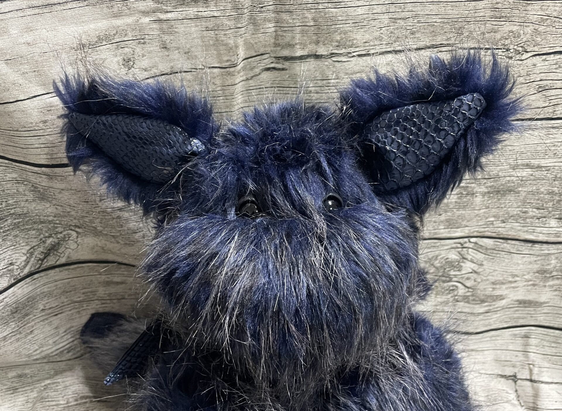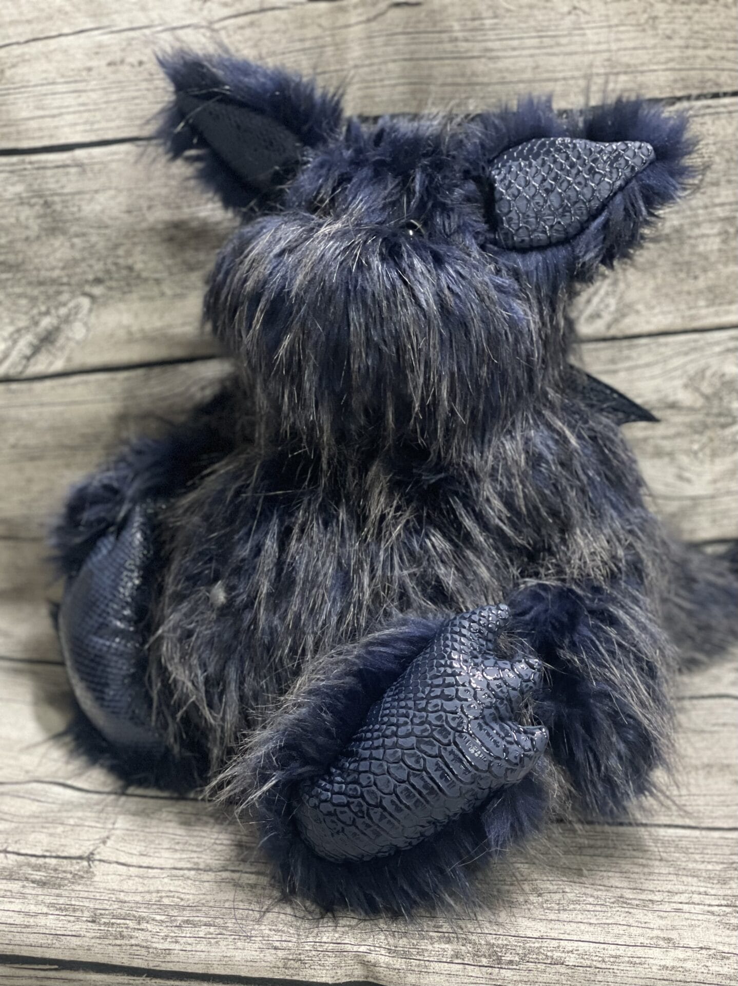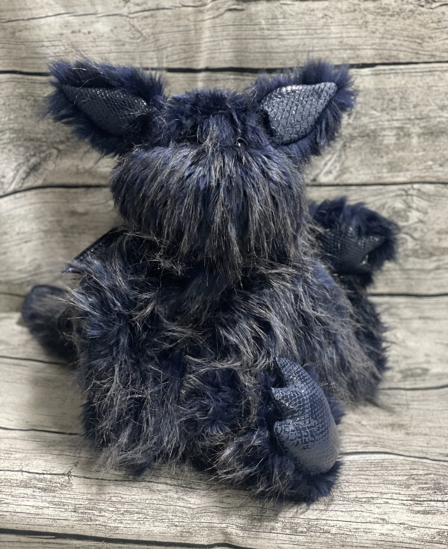 Er ist aus dunkelblauen Plüsch mit silbergrauen Spitzen gefertigt.